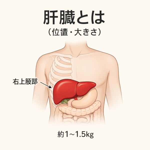 肝臓は体の右上腹部、ちょうど肋骨の下あたりにある大きな臓器です。横隔膜のすぐ下に位置しており、胃や腸などの消化器とも近い場所にあります。触って直接確認することは難しいですが、体の中では非常に重要な役割を持つ臓器として知られています。