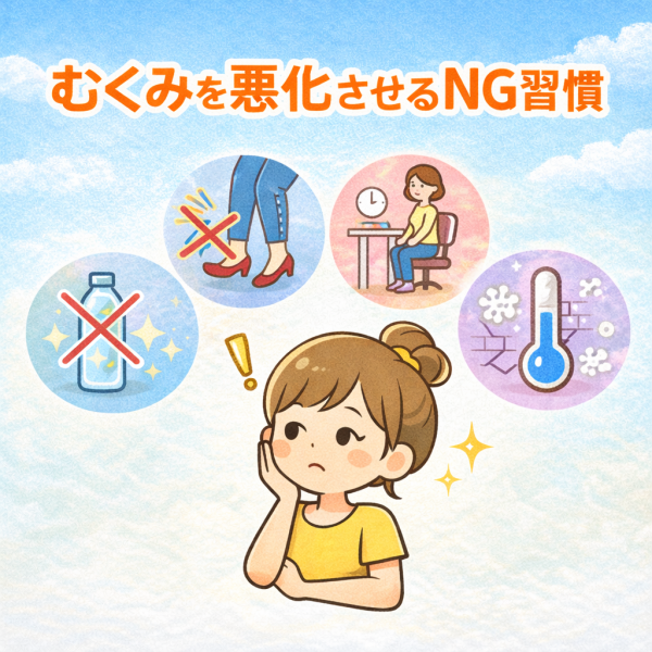 特にウエストや太もも、ふくらはぎを圧迫する服や靴は、体の流れを妨げる可能性があるとされています。長時間続くと、むくみを感じやすくなることもあります。