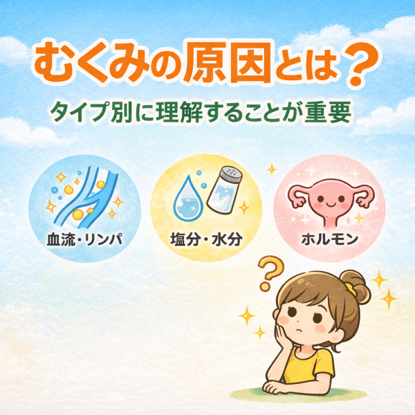 むくみは、体の中の水分バランスや流れがうまくいかないことで起こるケースが多いとされています。ただし、その背景には血流やリンパの問題だけでなく、食事・生活習慣・ホルモンの影響など、いくつかの要因が関係していると考えられています。