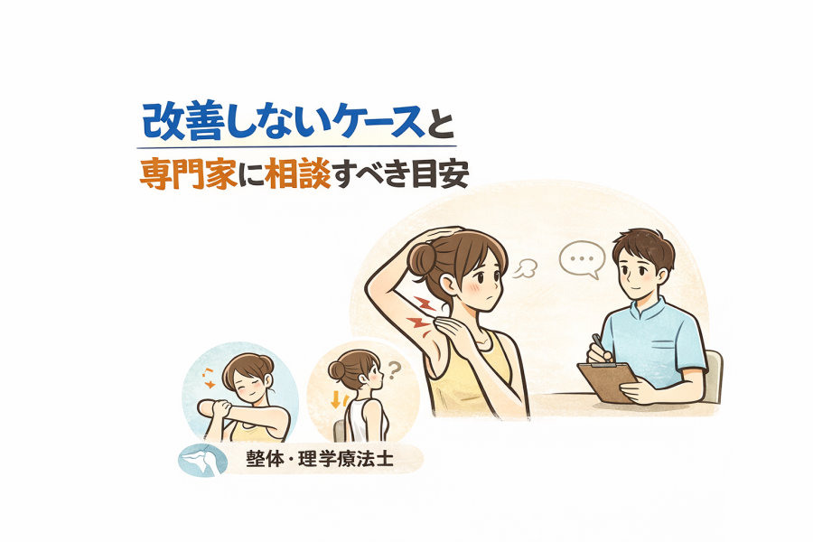 また、「左右差が極端にある」「姿勢を整えようとすると逆に不快感が出る」といったケースも、自己判断だけでは難しいことがあるようです。