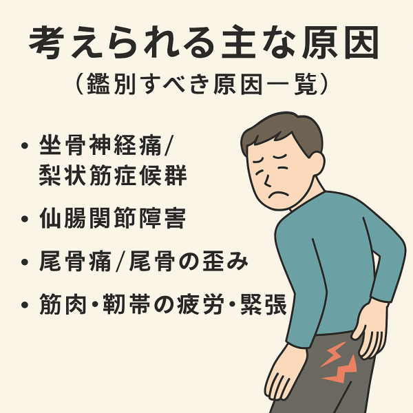 • 筋肉・靭帯の疲労・緊張(大殿筋の硬さ、ハムストリングスの付着部の負荷など) — 長時間の座り仕事、姿勢の悪さなどで起こる。