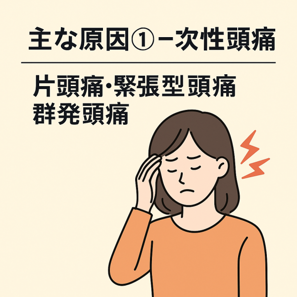 主な原因①:一次性頭痛 — 片頭痛・緊張型頭痛・群発頭痛