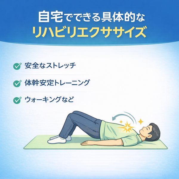 初期は、強い運動よりも「安全に動く感覚」を取り戻すことが重視されます。深い呼吸や、痛みの出にくい範囲で体を動かす軽い体操が中心です。無理をしないことが結果的に近道になると言われています。