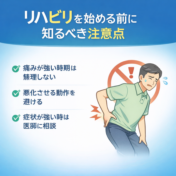 痛みが強い時期は、「早く動かしたほうがいい」と焦りがちですが、無理な運動は逆効果になる場合があると言われています。まずは痛みが落ち着く姿勢や動作を見つけ、負担を増やさないことが大切です。横になる姿勢や、腰を反らさない体勢で楽になる人も少なくありません。