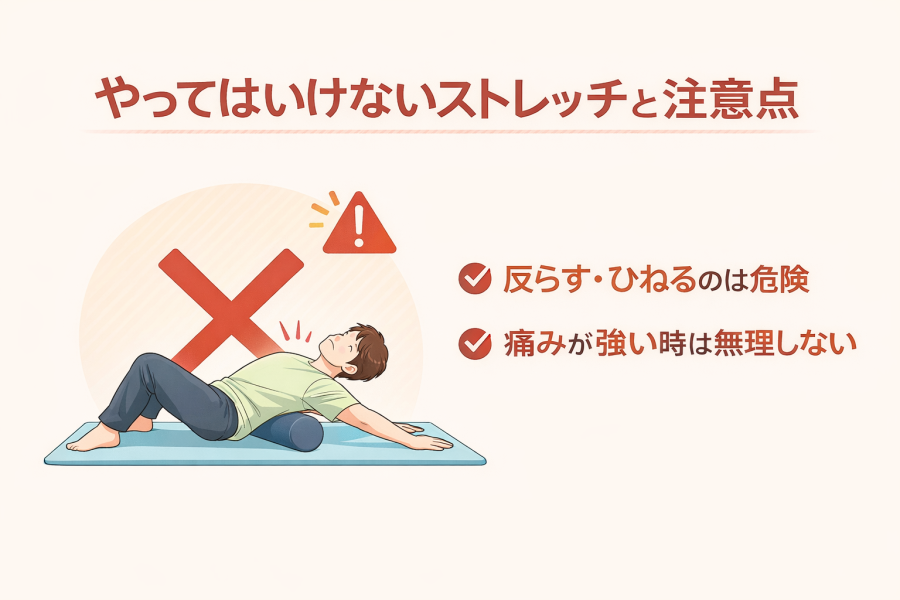 ストレッチポールやテニスボールは便利ですが、腰に直接当てる使い方は控えたほうがよいと言われています。違和感が強い場合は、専門家に相談する目安になります。