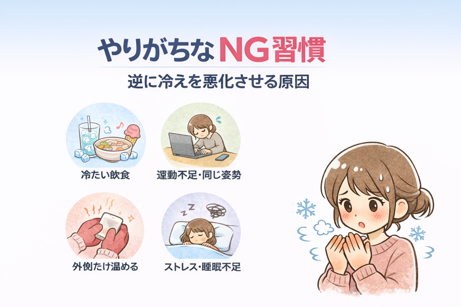 こうした日常の積み重ねが、気づかないうちに冷えやすい状態を作っているケースもあると言われています。少しずつ見直していくことが、改善への一歩になるかもしれません。