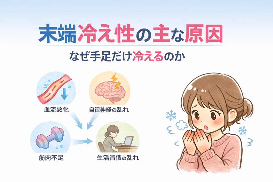 末端冷え性は、単純に寒いから起こるというよりも、体の中の“バランス”が関係していると言われています。特にポイントになるのは、血の巡り・筋肉・自律神経・生活習慣といった要素です。