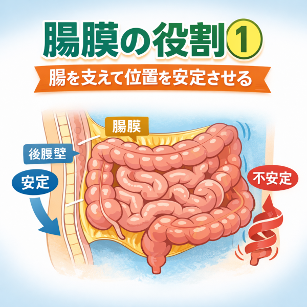 腸は長く複雑な形をしているため、もし固定がなければ、体を動かすたびに大きく位置が変わってしまう可能性があります。腸膜があることで、腸は適度な可動性を保ちつつ、安定した配置を維持しやすくなっていると考えられています。