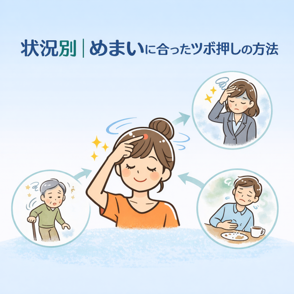 こんな相談を受けることがあります。ふわふわ・グラッとするめまいは、自律神経のバランスや首まわりの緊張が関係しているケースがあると言われています。このタイプでは、百会や風池など、リラックスを意識できるツボを選ぶ考え方があります。