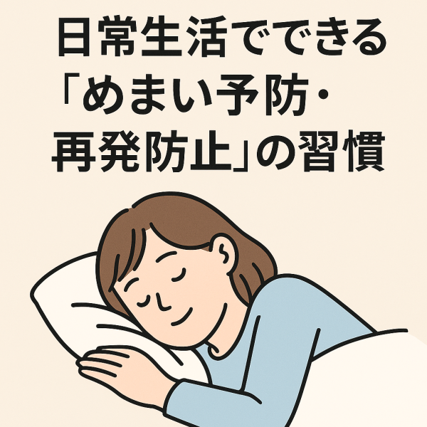 めまいはその場の応急ケアも大切ですが、日常生活での過ごし方によって“起きやすさ”が変わると言われています。もちろん人によって背景は違いますが、「めまいをできるだけ起こしたくない」「再発をくり返したくない」と考える人に向けて、生活の中で取り入れやすいポイントをまとめました。どれも特別な道具は必要なく、今日からゆっくり始められる内容になっています。