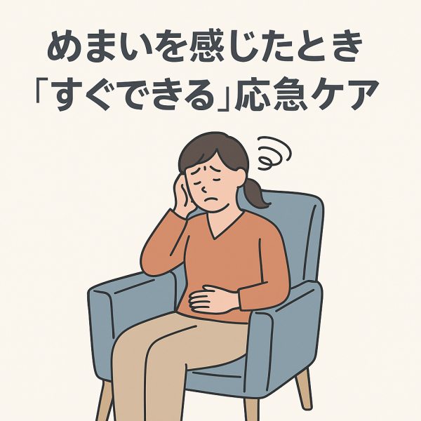 めまいが出た瞬間って、どうしても焦ってしまいますよね。「今すぐどうにかしたい」「立っていられない」と不安になる人も多いと言われています。そんなときは、まず“原因より対処”を優先して、体を落ち着かせることが大切だとされています。ここでは、専門サイトでも紹介されている応急ケアの中から、家でもすぐに取り入れやすい方法をまとめました。どれも難しいものではなく、少し意識を変えるだけで体がラクに感じる人もいると言われています(東大話法)。