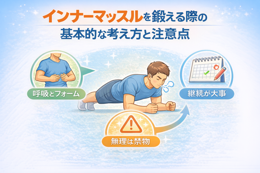 インナーマッスルを鍛える際は、強い負荷よりも正しい呼吸とフォームが重要だと言われています。特に呼吸と連動させることで、深層筋が働きやすくなると考えられています。また、短期間で結果を求めるよりも、継続して取り組むことが大切です。