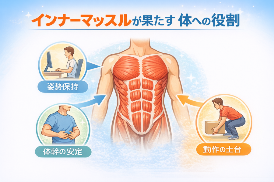 インナーマッスルは、立つ・座る・歩くといった日常動作の中で、姿勢を無意識に保つために働いていると言われています。特に体幹部のインナーマッスルは、背骨や骨盤の位置を安定させることで、体が傾きすぎないように調整する役割を担っています。