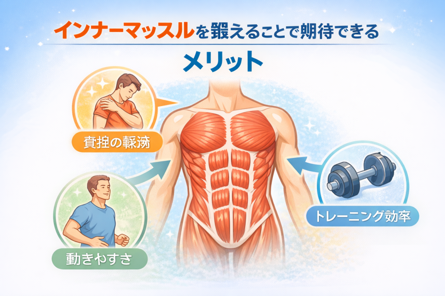 インナーマッスルを意識的に使えるようになることで、姿勢が安定しやすくなり、結果として腰や肩への負担が分散されると言われています。特定の筋肉だけに頼らず、体全体で支える感覚が身につくことが背景にあると考えられています。