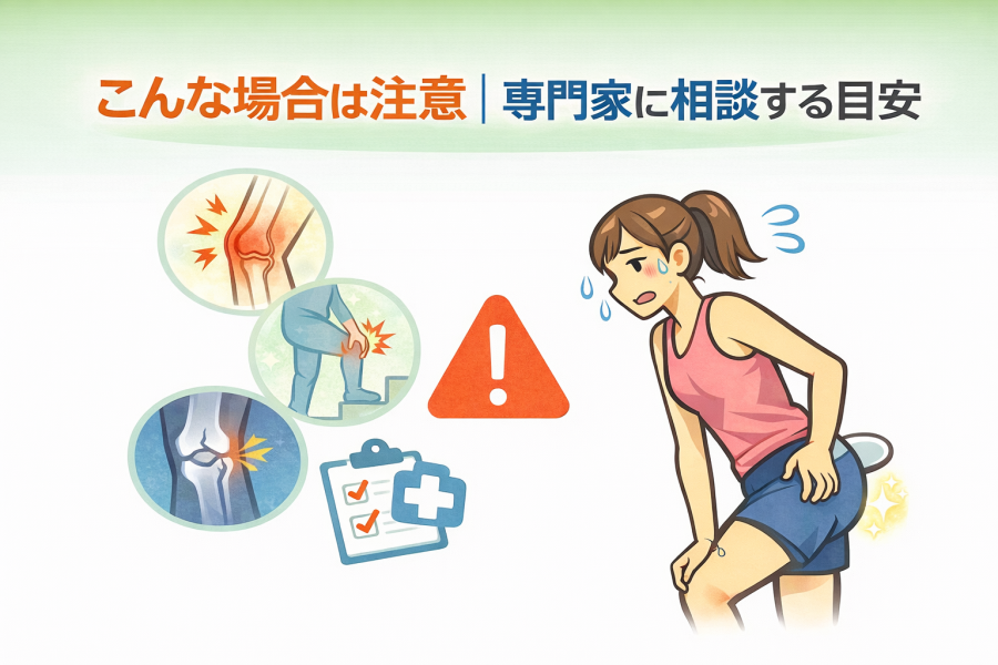 スポーツ中に痛めた後から違和感が続いている、階段の上り下りで鋭い痛みが出るなど、動作に強い支障がある場合は注意が必要と言われています。また、痛みが日常生活に影響するほど強い場合も専門的な視点が必要になることがあると紹介されています。