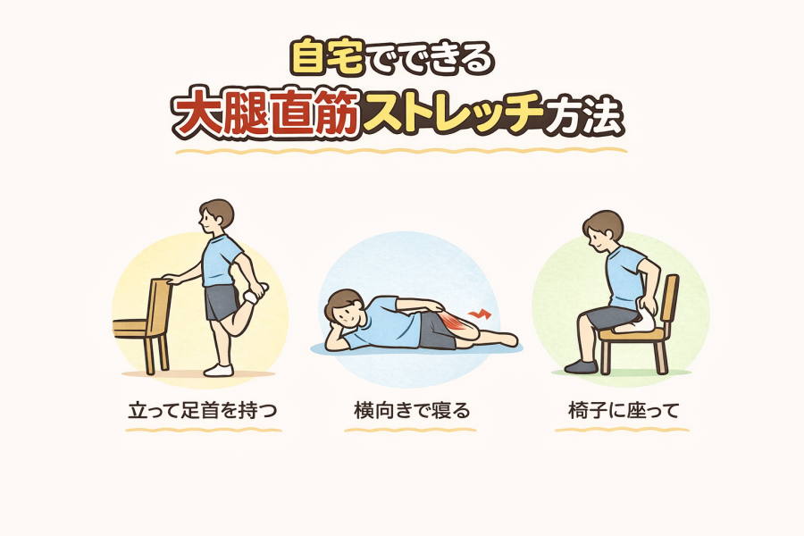 この質問もよくあります。大腿直筋ストレッチに加えて、軽い筋力トレを組み合わせる考え方も紹介されています。