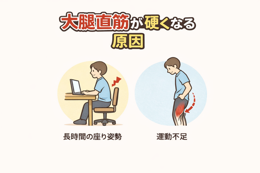 そんな悩みを感じる方は、日常の過ごし方そのものが影響している可能性があると言われています。大腿直筋は、動かさなさすぎても、逆に偏って使いすぎても硬くなりやすい筋肉です。ここでは、よく見られる2つの原因について整理してみましょう。