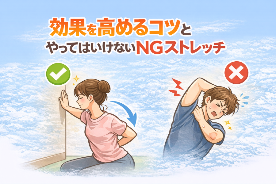 ストレッチ中は「呼吸を止めない」が基本です。息を吐きながら伸ばすことで、体の緊張が抜けやすいと考えられています。回数は1回20〜30秒を数回、強さは「気持ちいい」と感じる範囲が目安です。