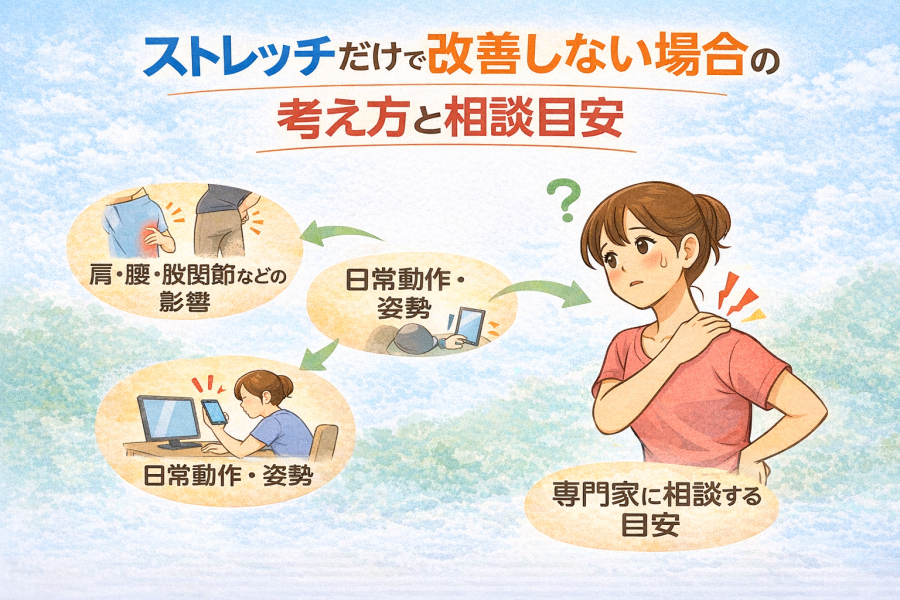 そんな不安を感じる方も少なくありません。ストレッチは有効なセルフケアの一つですが、それだけで改善を実感しにくいケースもあると言われています。ここでは、その考え方を整理します。