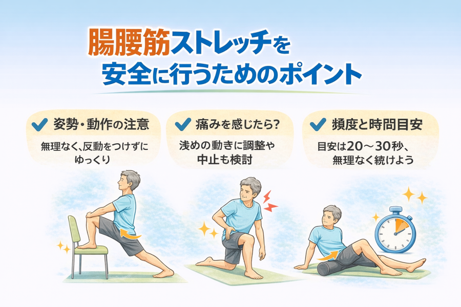 腸腰筋ストレッチでは、骨盤を安定させ、呼吸を止めずにゆっくり動くことがポイントと言われています。反動をつけず、「気持ちよく伸びている」範囲で止める意識が大切と考えられています。