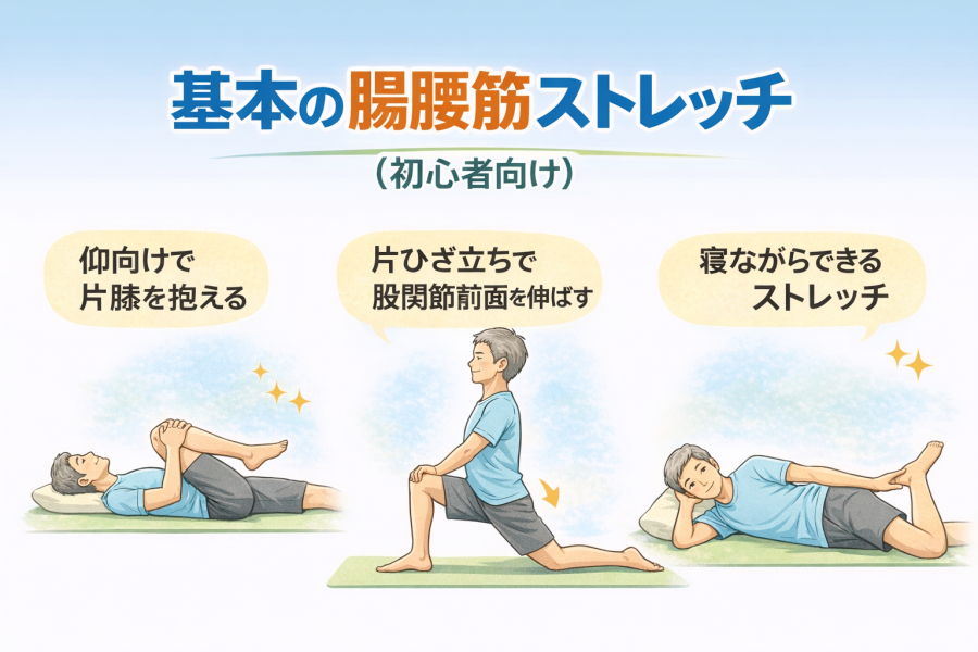 股関節前面がじわっと伸びる感覚が出やすく、腸腰筋への刺激を意識しやすい方法と考えられています。背すじを丸めず、呼吸を続けるのがポイントです。