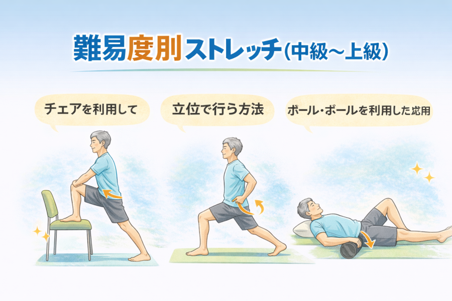 そんな方は、少し負荷を高めた方法を取り入れることで、より深い伸びを感じやすくなると言われています。ここでは、体の使い方に慣れてきた方向けの中級〜上級ストレッチを紹介します。