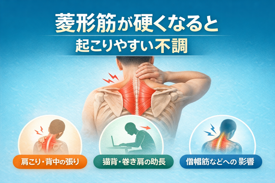 すると菱形筋は引き伸ばされたまま緊張し、血流が滞りやすくなると言われています。その結果、だるさや張り感として違和感が出やすくなる、という流れです。