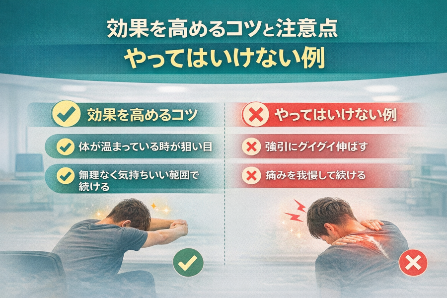 「菱形筋ストレッチ、やってはいるけど手応えがない…」そんな声も少なくありません。実は、**やり方そのものより“続け方”や“避けたいポイント”**が影響することがあると言われています。ここでは効果を高めるためのコツと注意点を整理します。