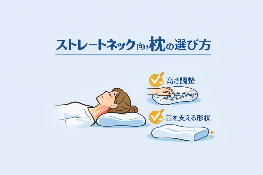 ストレートネックの場合、高すぎる枕は首を前に押し出しやすく、低すぎると首が反ってしまうことがあると言われています。