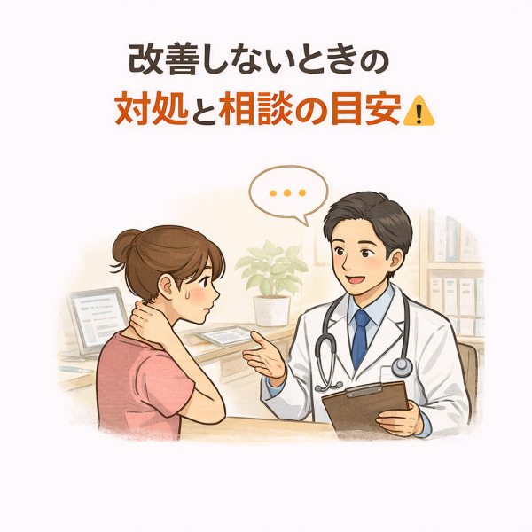 たとえば、仕事中に集中しづらいほどの首の不快感がある、寝ていても違和感が気になる、こうした状態が続く場合は相談を検討するタイミングとも考えられています。