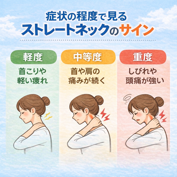 ストレートネックの症状は、段階によって感じ方が違うと言われています。ここでは、軽度・中等度・重度に分けて整理してみます。