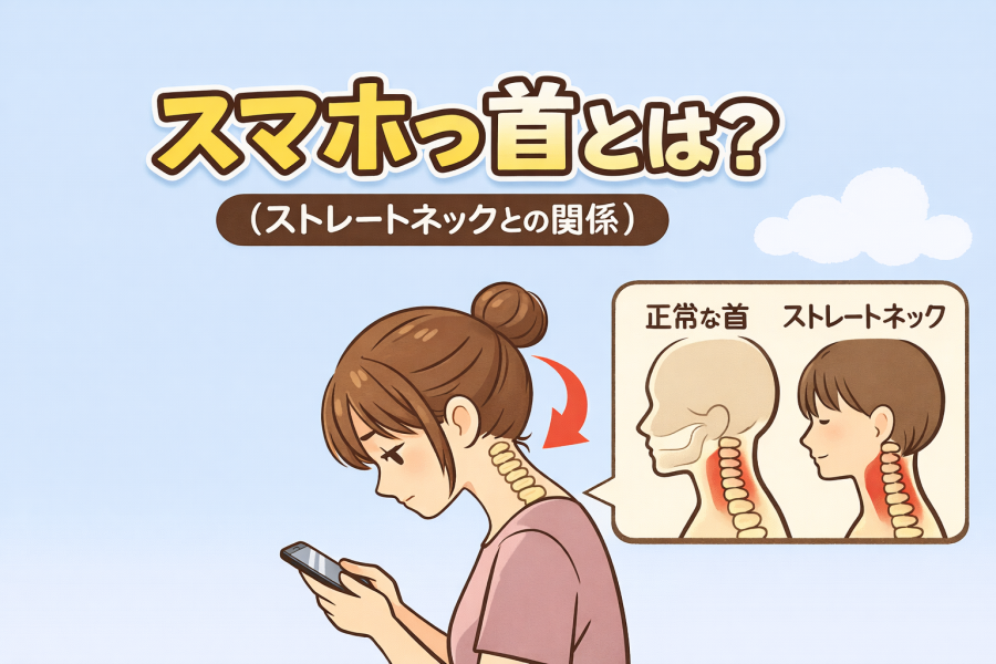そんな悩みの背景としてよく耳にするのがスマホっ首です。これは医学的な正式名称ではなく、スマートフォンを長時間使う生活習慣によって起こる首の状態を指す言葉として使われています。多くの場合、首の自然なカーブが失われたストレートネックと深く関係していると言われています。