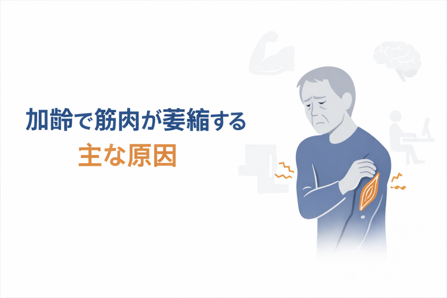 加齢での筋肉の萎縮は防げる?と考える前に、まず原因を整理しておきましょう。大きなポイントは「合成の低下」「神経の変化」「活動量の減少」です。