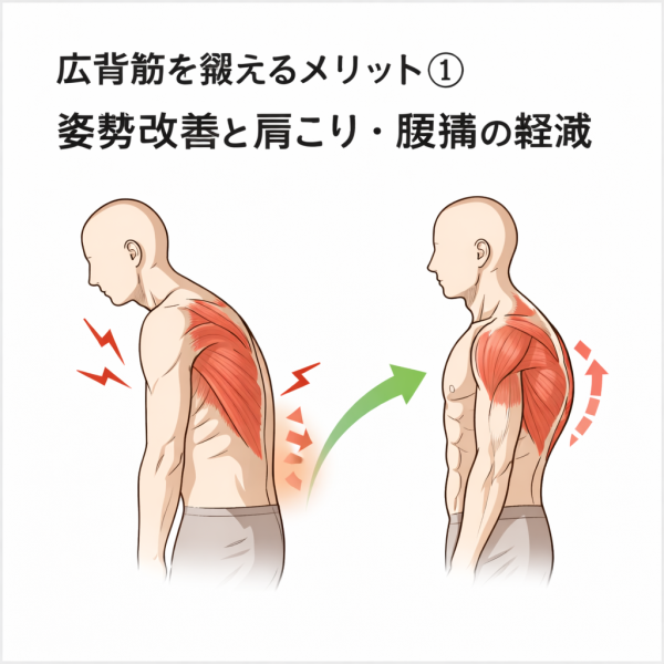 広背筋を鍛えるメリット①|姿勢改善と肩こり・腰痛の軽減