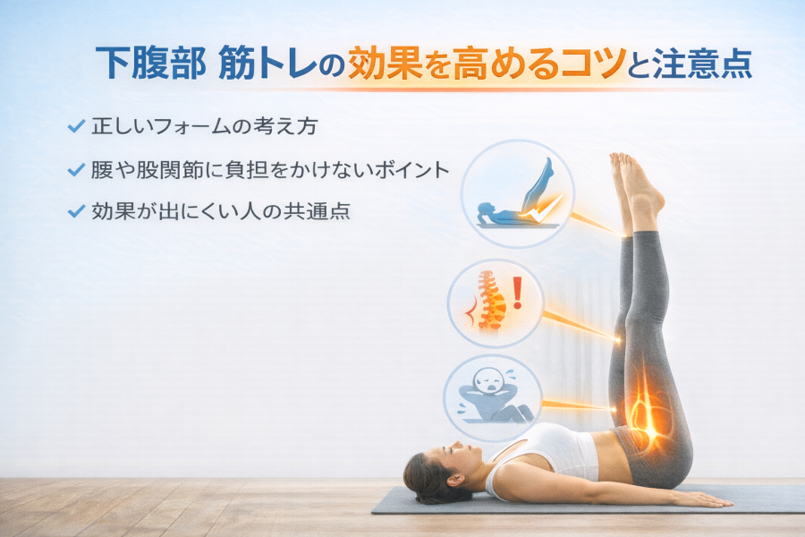 下腹部 筋トレで注意したいのが、腰や股関節への負担です。特にレッグレイズ系では、腰が浮きやすく、違和感を覚える人も少なくありません。そんなときは、膝を軽く曲げたり、可動域を小さくしたりする方法があると言われています。「きつい=効いている」と思いがちですが、無理に続けると負担が増える可能性もあるため、違和感が出たら動きを見直すことが大切と考えられています。