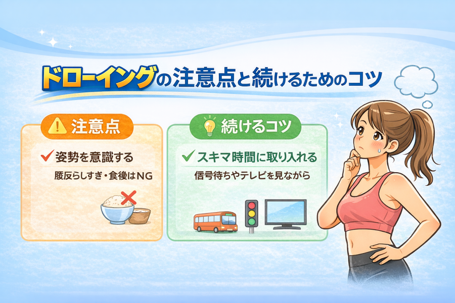 ドローイング自体が直接サイズダウンを保証するものではありませんが、お腹を内側から支える筋肉を意識する習慣がつくことで、見た目の変化を感じる方もいると言われています。