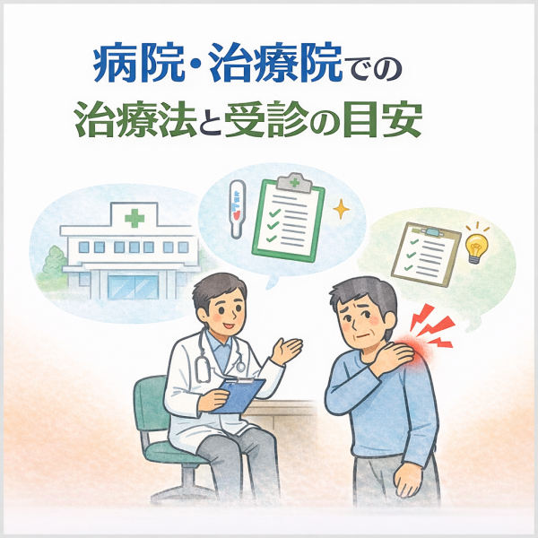 50肩の改善を考えるとき、こんな迷いが出やすいものです。実際、状態や時期によっては医療機関や治療院で体の状態を確認する選択肢もあると言われています。ここでは、一般的に知られている対応内容と、来院を考える目安について整理します。