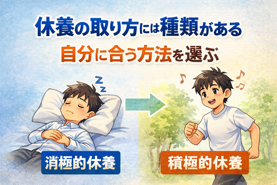 参考記事でも、休養には「休息・運動・気分転換・人との交流」など複数の要素があると紹介されています。つまり、休養とは疲れの種類に合わせて選ぶものであり、「何もしない=正解」ではないということです。