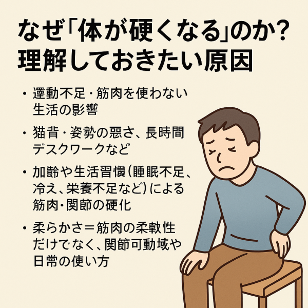 では、なぜ体は硬くなるのでしょうか。原因はひとつではなく、生活習慣や体の使い方が重なって、少しずつ硬さが積み重なると言われています。