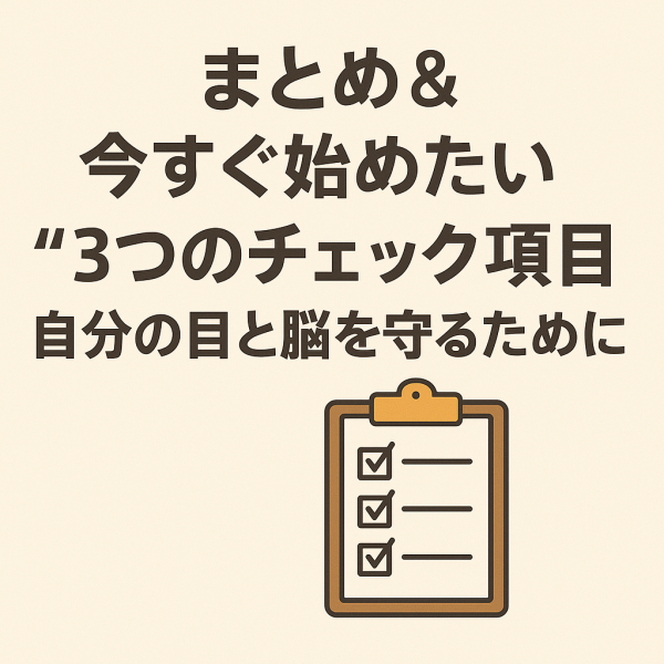 → 読者にとってのアクションプラン(①定期眼科②1時間作業→15分休憩③月1で目のセルフチェック)など。