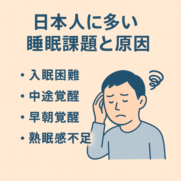 特に「入眠困難(寝つきが悪い)」「中途覚醒(夜中に目が覚める)」「早朝覚醒(早く目が覚める)」などは、多くの人が経験する悩みです。