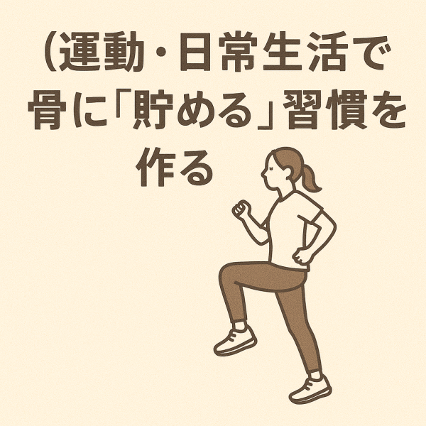 - 骨に荷重(骨加重)をかける運動(階段、かかと上げ、片足立ち、ジャンプなど)、姿勢・筋力・動かすことの重要性、座りっぱなしを避ける工夫