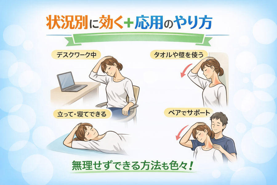 一方、寝た状態で行うと、重力の影響が少なくリラックスしやすいとされています。仰向けで首をゆっくり横に倒すだけでも、負担を抑えやすいと言われています。