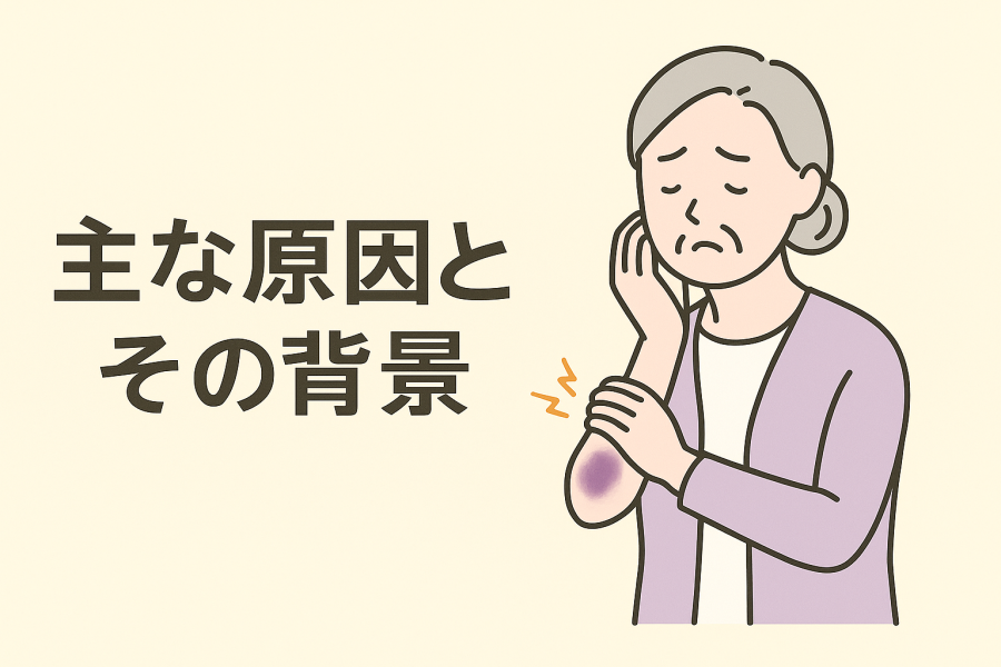 「ぶつけてないのにあざができる」――そんな時、まず気になるのが「なぜ?」という原因ですよね。実は、これにはいくつかの背景があると言われています。加齢や栄養、薬の影響、そして体の中の疾患など、日常生活から内側の変化まで幅広く関係していることが知られています。