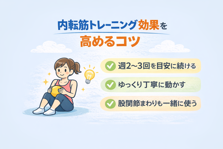 内転筋トレーニングに加えて、お尻や体幹のトレーニングを組み合わせることで、動作がスムーズになりやすいとも考えられています。偏りすぎない意識が、長く続けるコツだと言われています。