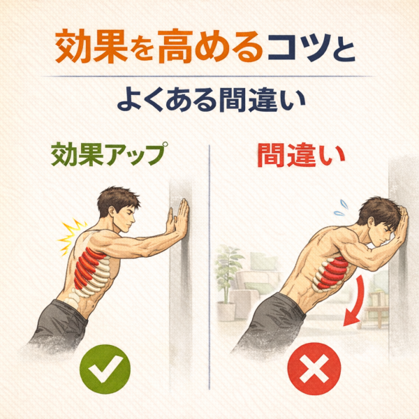 逆に、腕の力だけで押してしまうと、前鋸筋への刺激が入りづらい場合もあるようです。肩をすくめず、背中を丸めすぎないことも大事だと紹介されています。「肩甲骨を動かせているか?」と自分に問いかけながら行うことがコツと言われています。