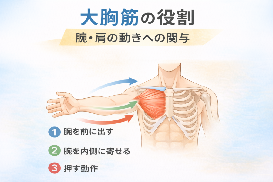 この構造によって、腕を前に出す動きや、内側に寄せる動きに関わると考えられています。たとえば、ドアを押す動作や腕立て伏せの動きも、大胸筋の働きが関与すると言われています。