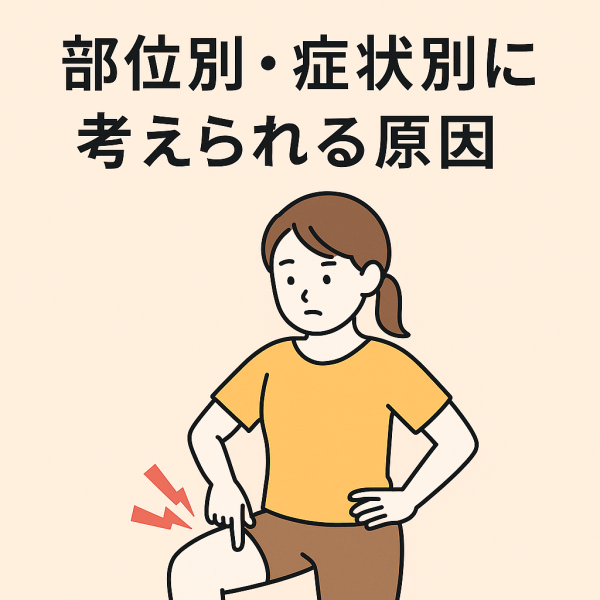 そして**付け根(股関節付近)**の痛みは、骨盤まわりのバランスや姿勢、体重のかけ方などが関わるケースも見られます。