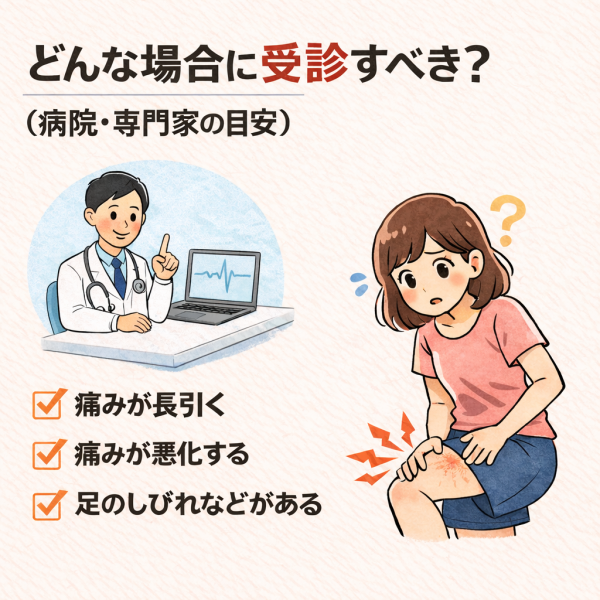 また、太ももの痛みに加えて、しびれや力の入りにくさを感じるときも、専門的なチェックが参考になることがあるようです。