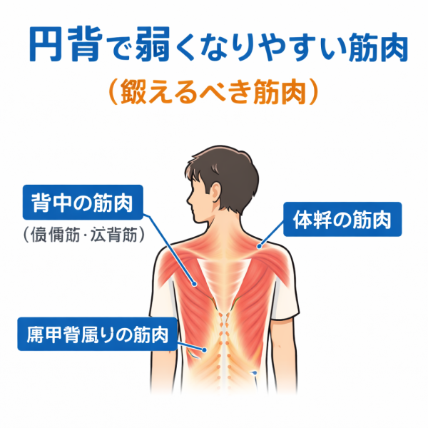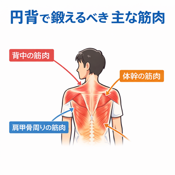 円背の姿勢では、背中を支える筋肉の働きが低下しやすいと言われています。代表的な筋肉としては、背骨の動きを支える筋肉や、肩甲骨を安定させる筋肉などが挙げられることがあります。